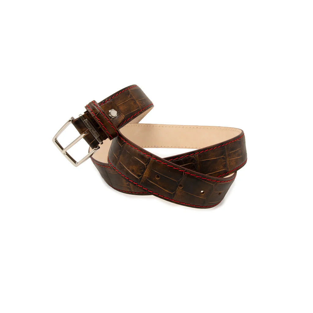 This brand new Faux Alligator pattern from Italy, all handcrafted in the USA, is the closest faux alligator we have come across. This dark brown color dyed belt is a hardy touch for any occasion. Whether your smoking balls or smoking a pipe, this tobacco finish will fit right in.