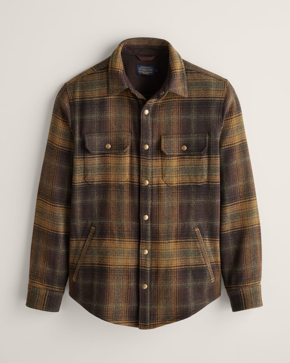Worn alone or layered, this snap-closure men's wool shirt offers outstanding details in substantial 7.4-oz Oregon Tweed® woven in our Pacific Northwest mills. It features two snap-close chest pockets, two welt pockets, and contrast solid fabric lining the neck, collar and placket.