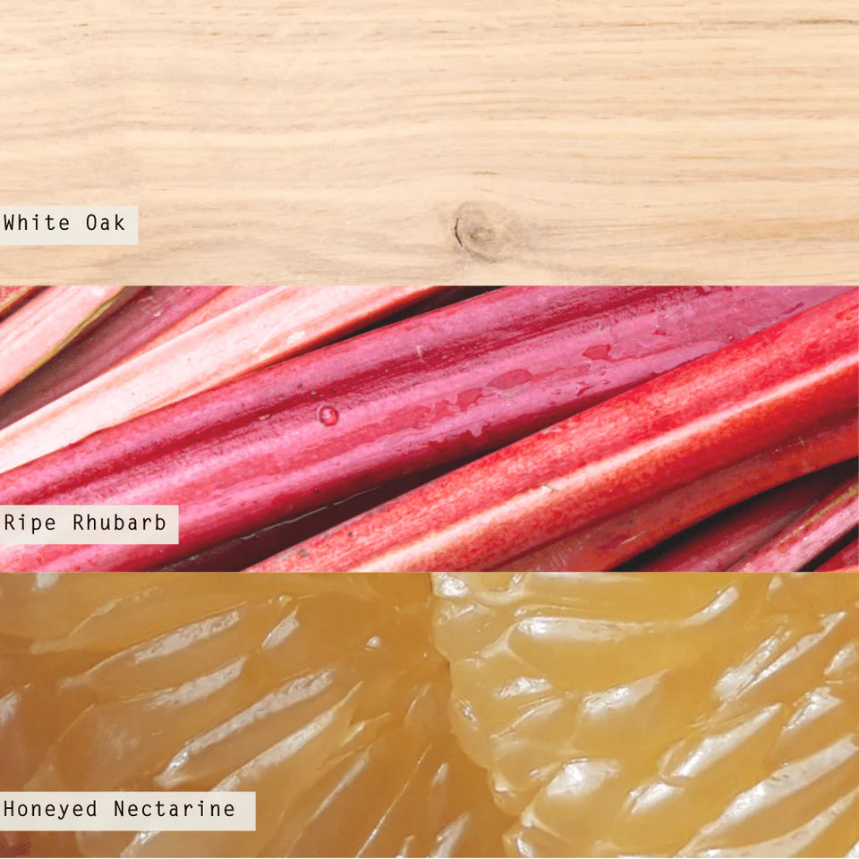 Grounded in white oak, with a heart of ripe rhubarb, and kissed with honeyed nectarine.