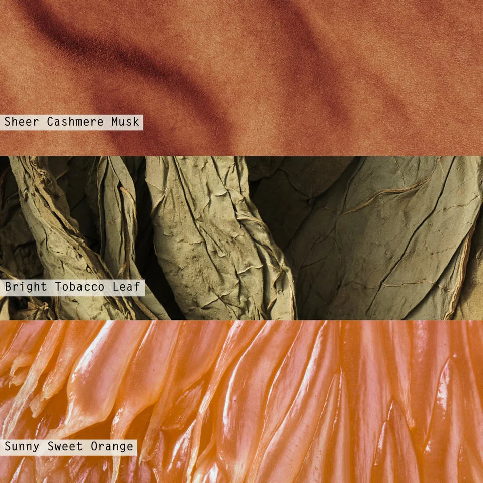 Grounded in sheer cashmere musk, with a heart of bright tobacco leaf, and kissed with sunny sweet orange.