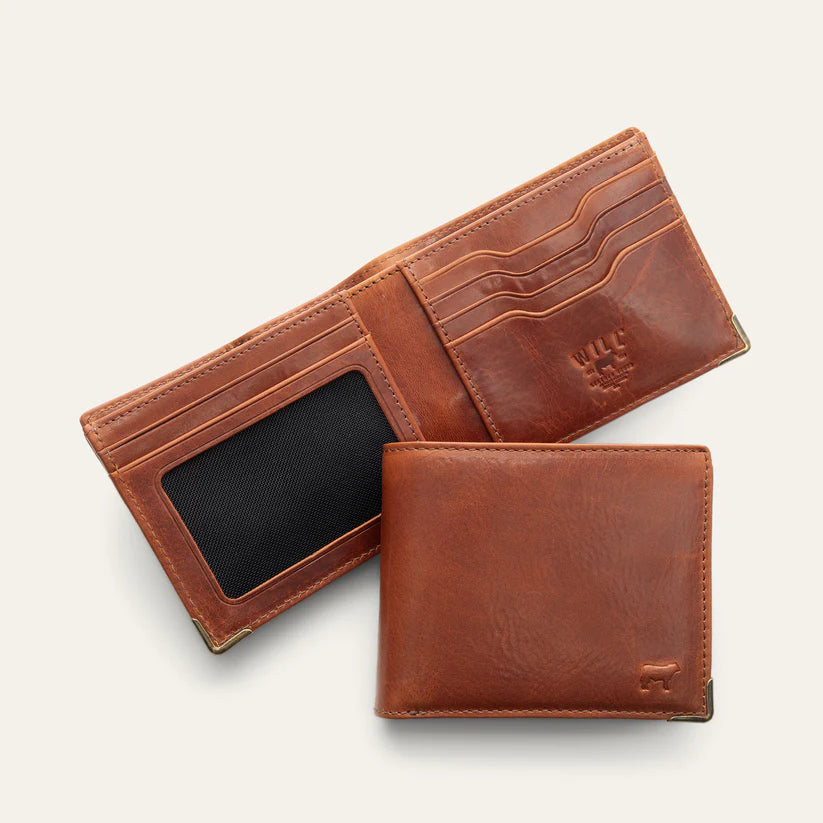 The William Magnate Billfold is handcrafted from certified full-grain, vegetable-tanned Italian leather. It features 5 card sleeves, a metal-mesh-covered ID slot, two hidden card sleeves, and two separate billfold compartments to keep you organized. The bottom corners are reinforced with antique brass for added protection against wear—ensuring our Magnate Billfold is built to last a lifetime. We stand behind our product—guaranteed for life.